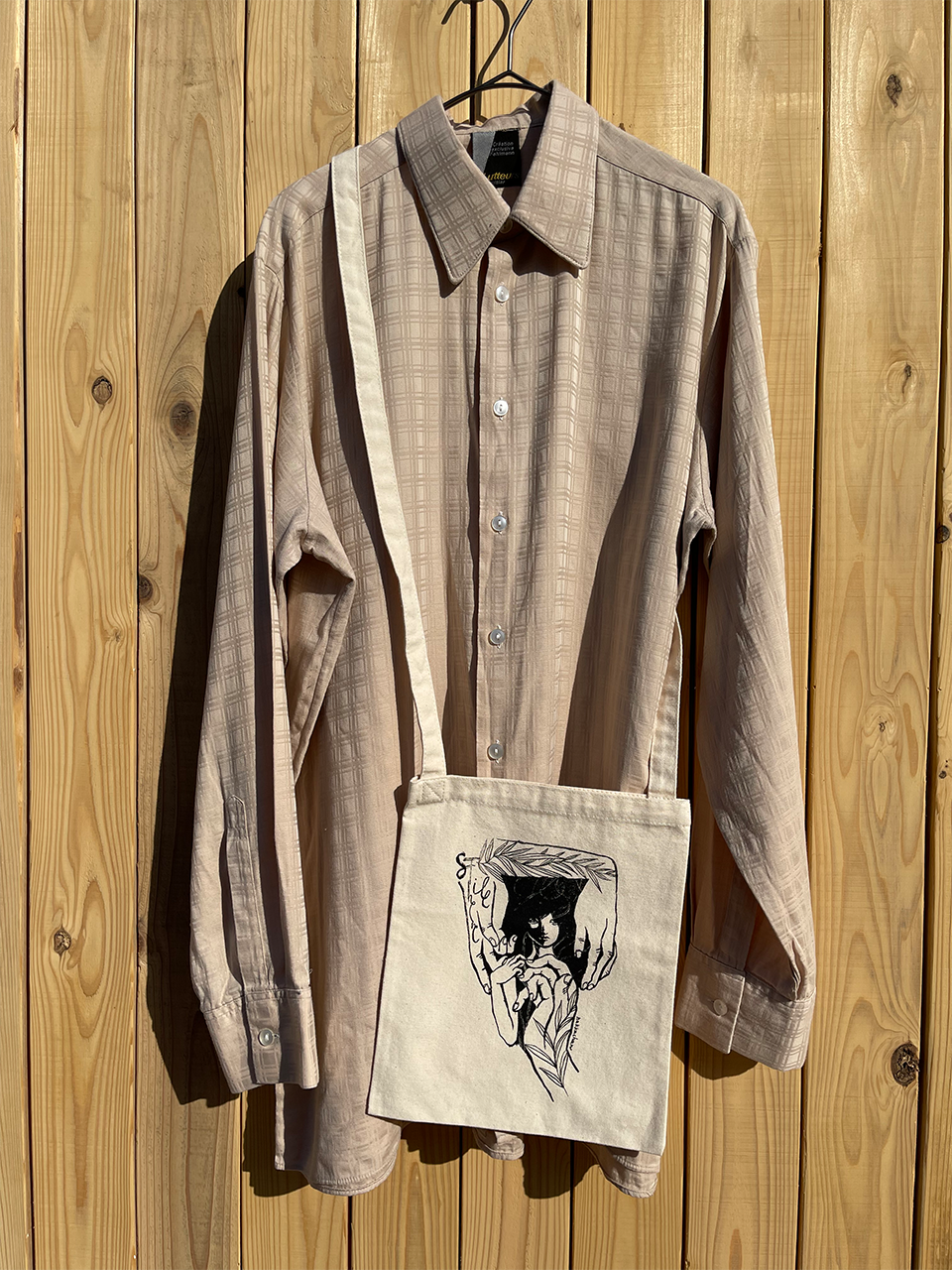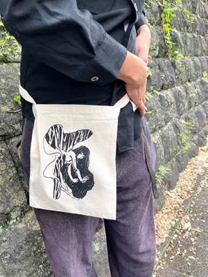 This is a sackosh printed with "Still here", a work by "Hakkachan", an artist based in Tokyo and LA.